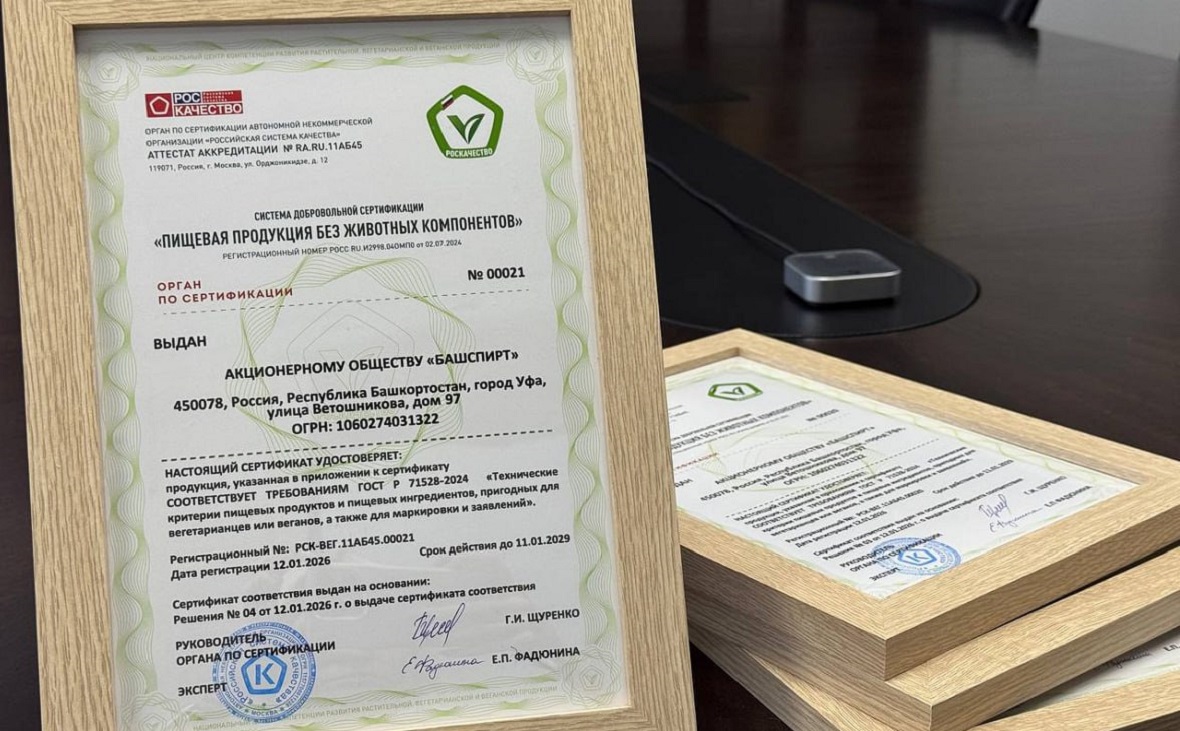 Компания «Башспирт» получила сертификат Роскачества на первую в России алкогольную продукцию по веганским стандартам. Производитель сможет ставить соответствующую маркировку на спиртные напитки, включая бальзамы, и уксус.